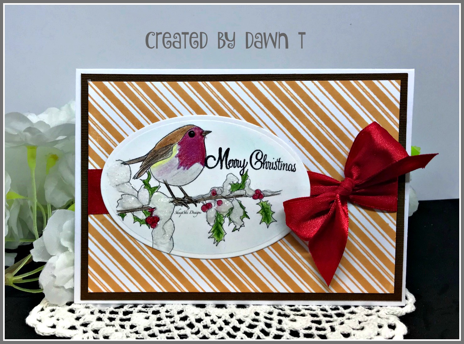 I used my Prismacolor pencils to colour up this beautiful Robin. I used a Spellbinders oval to die cut and then added some soft blue ink blending while the die was in place. I added some Ranger glitter glue and some extra fine glitter to make my snow. The background is a piece of card I had stamped last year with a Catherine Pooler stripe stamp. Added a big red ribbon and a little Penny Black sentiment.